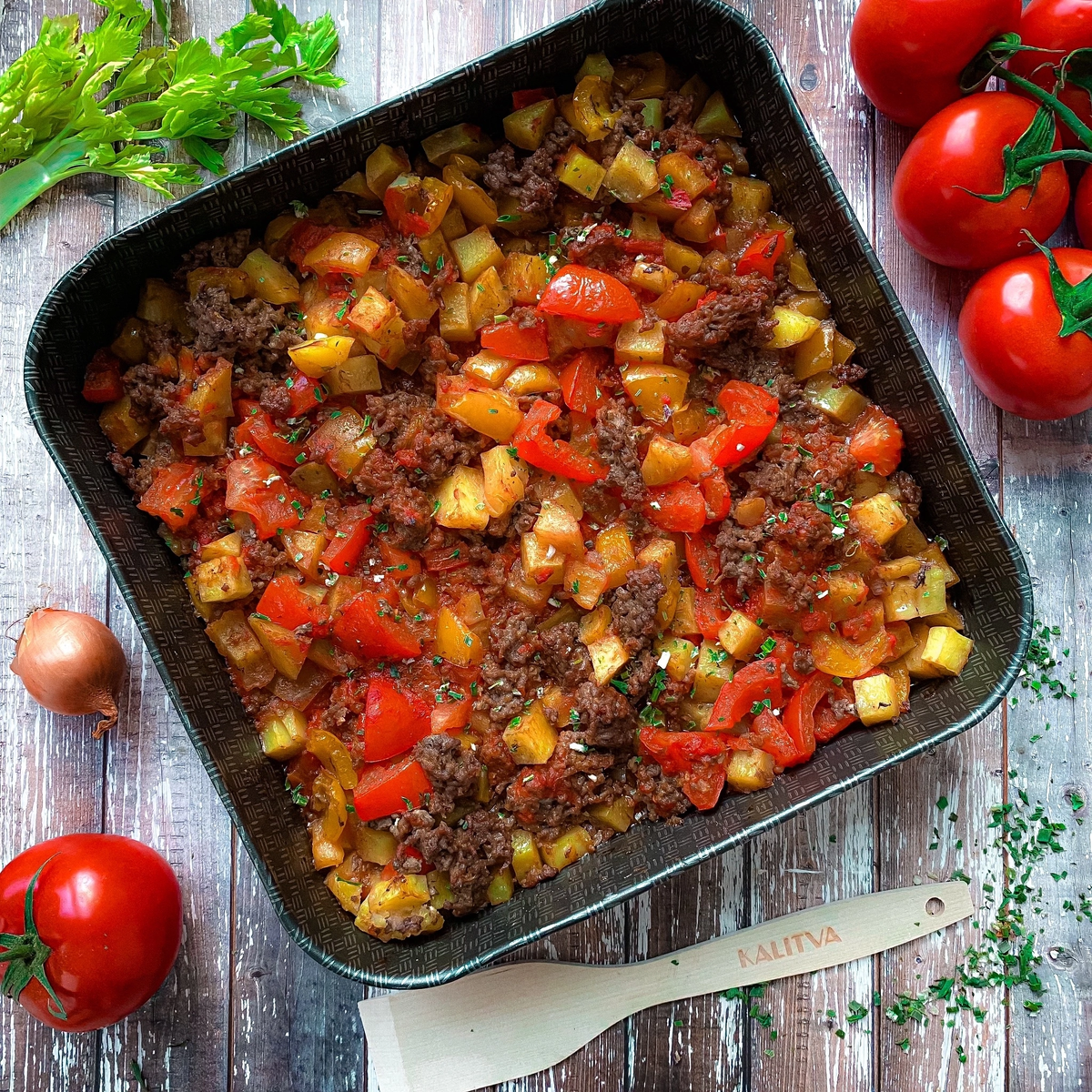 Простое и безумно вкусное блюдо в новом квадратном противне линейки DREAM. Что может быть лучше, чем просто смешать все ингредиенты, поставить в духовку на 50 минут и вытащить полностью готовый ужин? ✅ болгарский перец - 2 шт ✅ картофель - 5 шт ✅ лук - 2 шт ✅ чеснок - 3 зубчика ✅ помидоры - 3 шт ✅ фарш - 700 гр ✅ оливковое масло - 2 ст. д ✅ томатная паста - 2 ст. л ✅ соль, специи - по вкусу Помидоры и томатную пасту лучше добавить за 20 минут до окончания времени выпекания — чтобы картофель уже успел приготовиться и стать мягким и рассыпчатым. Приятного аппетита!