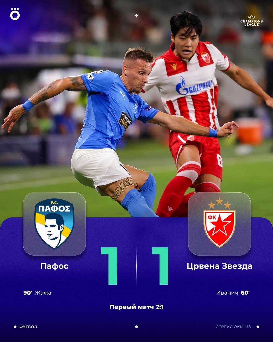 День дебютантов ЛЧ продолжается! «Пафос» впервые сыграет в общем этапе 🔥 «Црвена Звезда» — мимо Лиги чемпионов. Жажа выбил сербов шикарным голом на 90-й минуте.