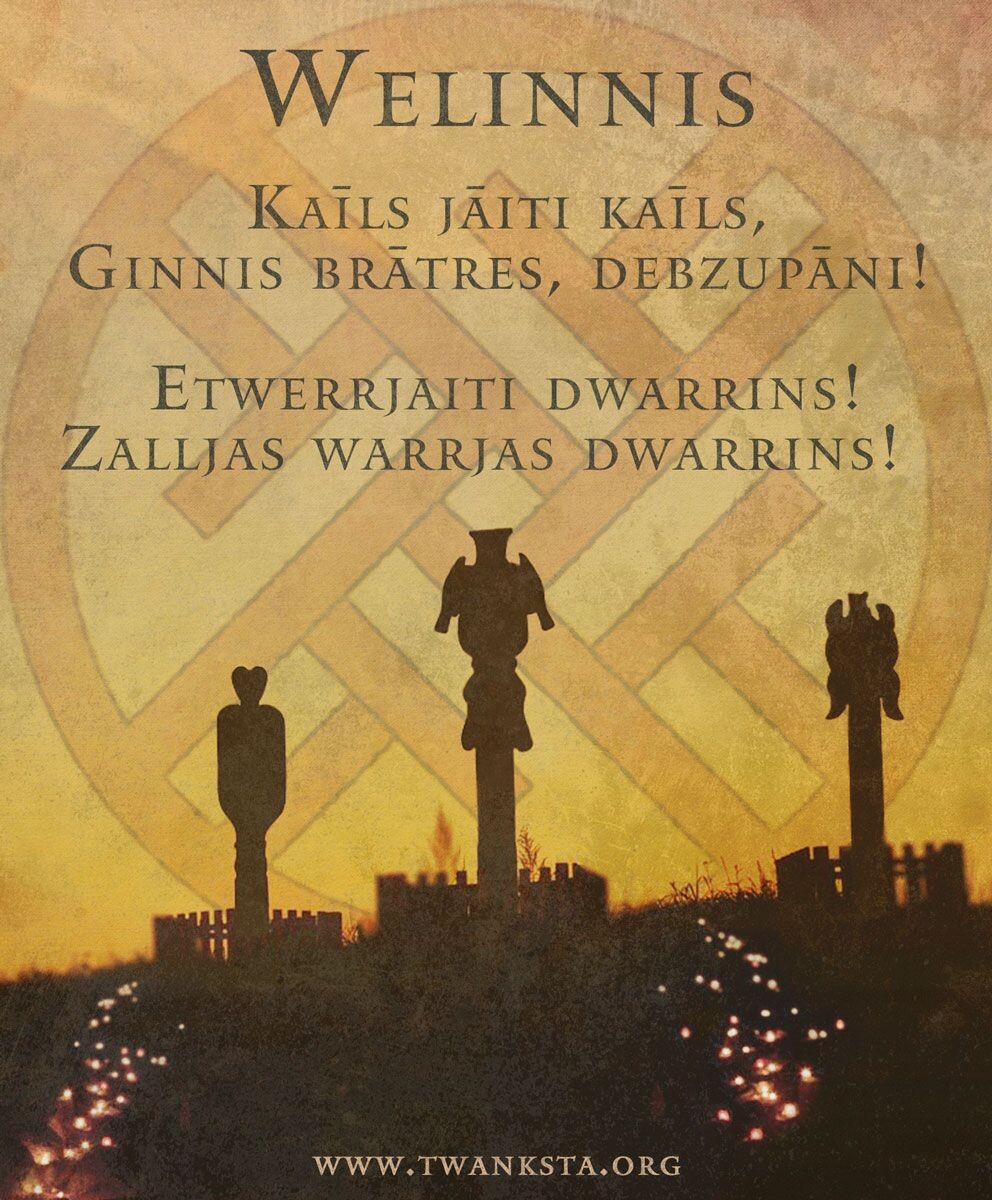 #prussian_songs Всем доброго дня! Labban dēinan wisēimans! Начинаем новую рубрику - «Прусские песни по вторникам», и теперь мы каждую неделю будем слушать, читать и переводить самые известные прусские народные песни! Начнём мы, пожалуй, с одной из самых часто исполняемых песен - Zallis warris. Вот её расширенная версия на самбийском диалекте прусского языка (я её пою детям на ночь каждый вечер): Ō, kas wakēi ten, zallis warris, zallis warris? Ginnis, brātres, debzupāni. Ka kwaitēi tū, ginni, zallis warris, zallis warris? Ginnis, brātres, debzupāni. Ka kwaiteitei, ginnis, zallis warris, zallis warris? Ginnis, brātres, debzupāni. Wīrikan kwaimāi, zallis warris, zallis warris, Ginnis, brātres, debzupāni. Kas etwerrja dwarrins, zallis warris, zallis warris? Ginnis, brātres, debzupāni. Zallis warris dwarrins, zallis warris, zallis warris? Ginnis, brātres, debzupāni. Mes dins wirstmai wīrans, zallis warris, zallis warris, Ginnis, brātres, debzupāni. (продолжение в комментарии)