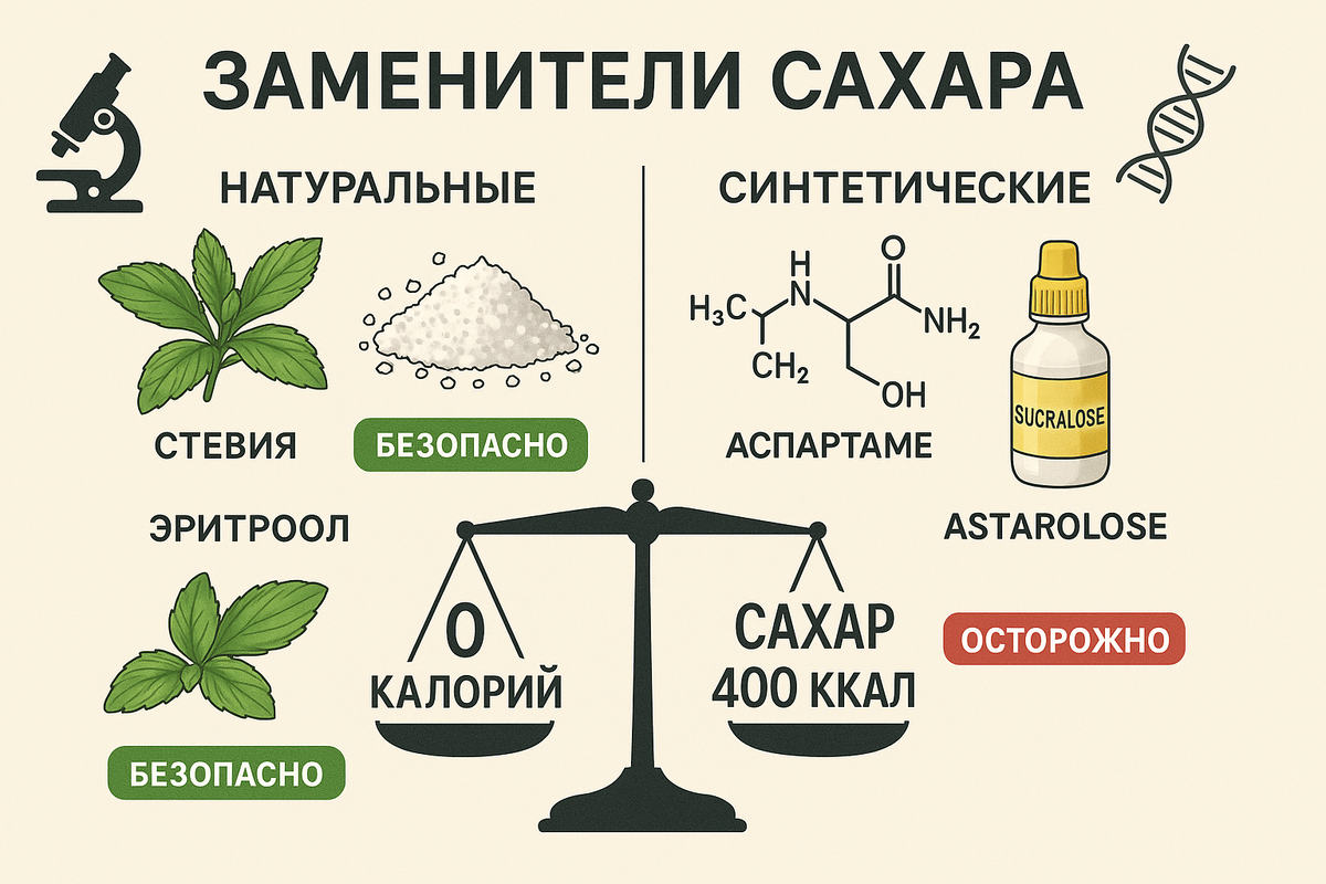 Стевия \ Натуральный \ 0 калорий, не влияет на сахар крови\ Горьковатое послевкусие \4 мг/кг веса Эритрит \ Натуральный \Нет послевкусия, хорош для выпечки\ Может слабить в больших дозах\ 0.6 г/кг веса Аспартам \ Синтетический \Очень сладкий (1 таблетка = 1 ч.л. сахара) \ Распадается при нагреве (не для выпечки!) \40 мг/кг веса Сукралоза \Синтетический \Без послевкусия, термостабилен \Снижает разнообразие микробиоты \5 мг/кг веса *Рассчёт для человека 70 кг: аспартам = 2800 мг (~100 таблеток), сукралоза = 350 мг (~70 таблеток).* Главный вывод: В рамках суточных норм заменители безопасны. Но лучше отдавать предпочтение натуральным (стевия, эритрит). Миф: «Заменители вызывают выброс инсулина как сахар».