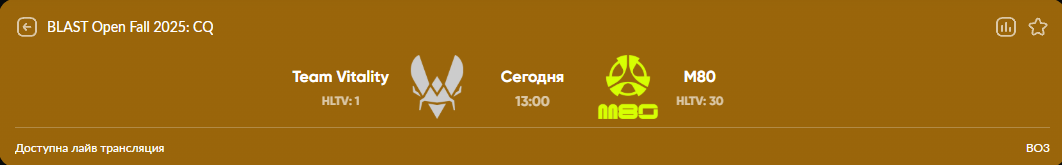 Победа Vitality 2:1. Коэф. ~3.8. M80 в форме и могут взять карту на своем пике (Overpass), но для победы в серии у них не хватит опыта против ZywOo и компании. Рискованная, но перспективная ставка.
