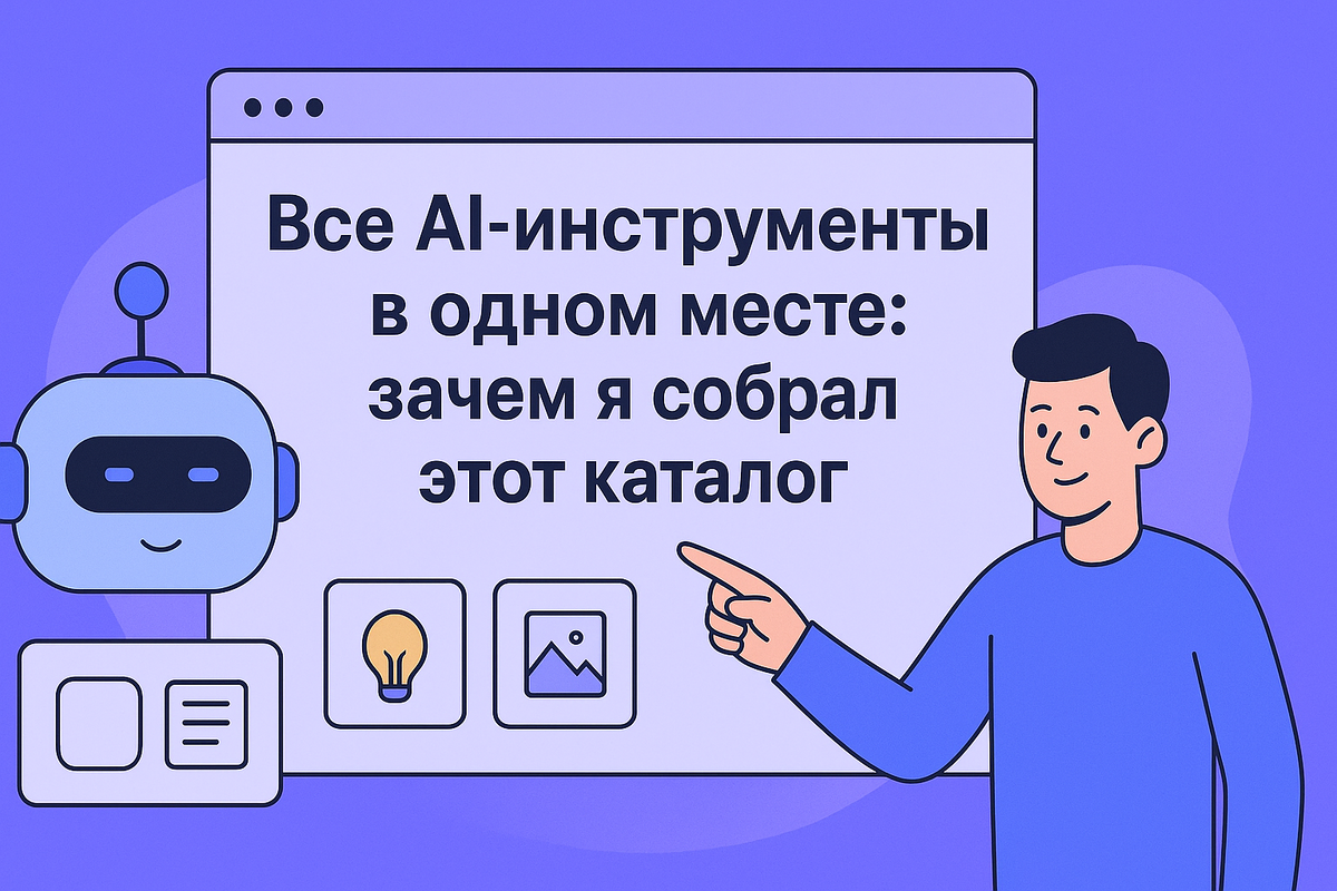 Чтобы сэкономить время и сделать навигацию по этому океану технологий проще, я собрал единый каталог AI-инструментов, распределив их по категориям. Теперь всё нужное можно найти в одном месте — будь то приложение для написания текстов, сервис для создания сайтов или инструмент для распознавания речи.