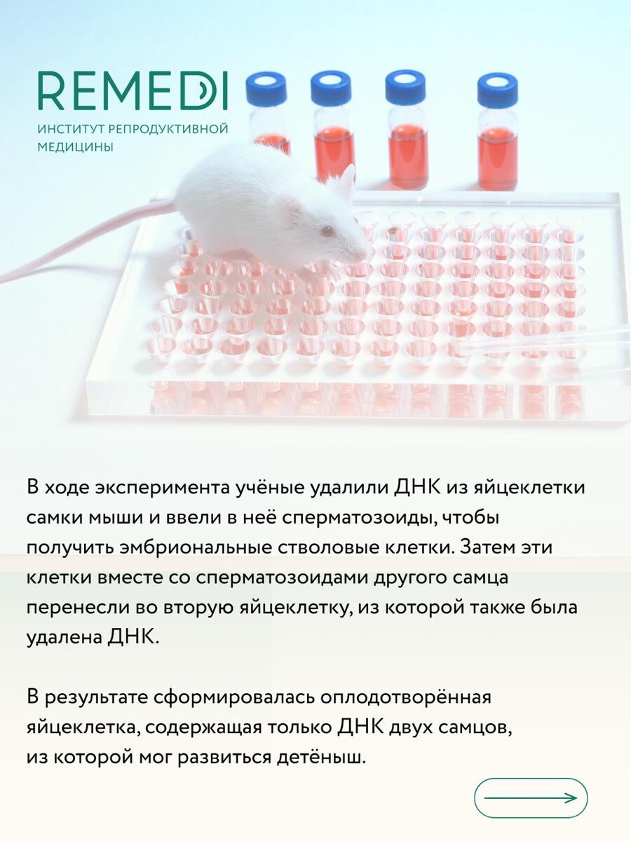 🔍 Как мыши помогут людям в репродукции Совсем недавно мы узнали, что китайские учёные разработали новый метод получения потомства от двух мышей мужского пола. Это исследование может помочь лучше понять механизмы импринтинга и разработать методы генной терапии для лечения соответствующих заболеваний у людей 🧬 А вот как комментирует исследования врач генетик клиники REMEDI Тарасова Юлия Александровна: «Болезни импринтинга встречаются достаточно редко, но при этом представляют собой огромную проблему для генетиков — их крайне сложно прогнозировать, диагностировать и тем более лечить. Методика, предложенная китайскими учеными, важна не только результатом — рождением потомства, но и тем, что в процессе последовательного внесения генетических изменений было получено большое количество информации о том, какие именно гены и в каком варианте влияют на различные процессы развития. Это дает направление дальнейшим исследованиям и, надеюсь, в обозримом будущем приведет к появлению эффективных
