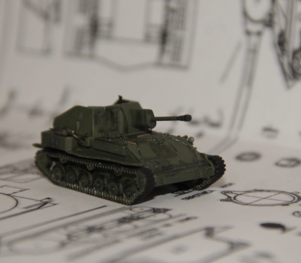 Всем привет. Представляю вам свою готовую модель лёгкой советской противотанковой САУ. Кстати, обзор на эту статью вы можете прочитать тут: Вот и фото готовой модели: Модель сама по себе приятная, но так как катки и траки даны единой деталью, резиновые бандажи катков очень непросто прокрашивать. Модель планировалась не совсем «парадная» но и не убитая в конец. Также чуть позже я нанёс декаль. Совет: перед нанесением декали с помощью ватной палочки смочить поверхность. Так легче если что поправить декаль. Немного обрезал и помял крылья надгусеничных полок. Шанцевый инструмент с трудом прокрасил. С помощью кисти из щетины и стальной краски нанёс царапины. Прокрасил всё внутри. Кстати хотите повторить мой опыт, то заказывайте модель и скидывайте свой результат в комментарии.