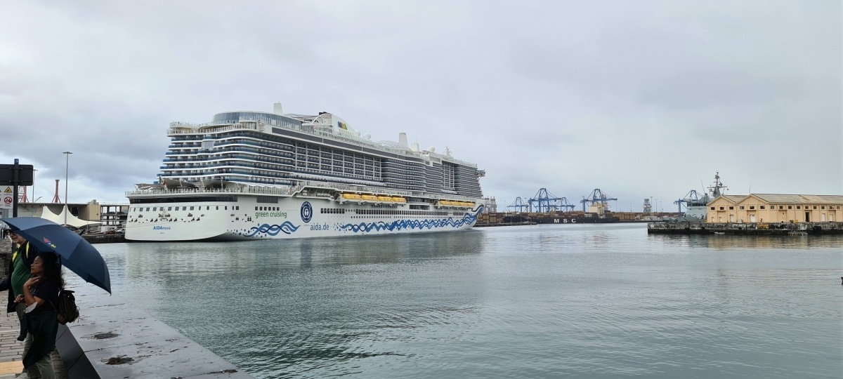 Наш круизный корабль — AIDAnova в порту острова Гран Канария. Чудо немецкой инженерии в аэропорту острова. Граффити на одном из кафе рядом с портом. Из-за плохой погоды, мы не пошли в город, а остались на борту корабля. Вид на город во время выхода корабля из порта. Первый круиз на корабле AIDAnova.