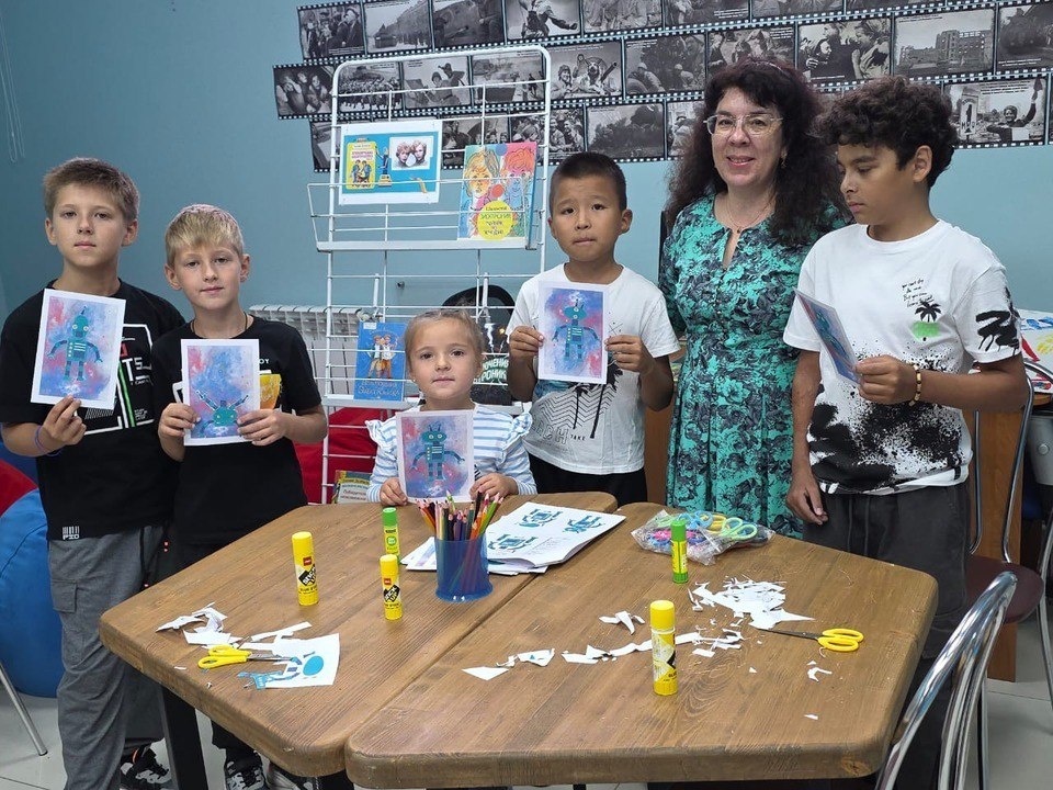 «Мальчик из чемодана, или как быть человеком?» 📖 26 августа в Сахалинской областной детской библиотеке прошёл литературный час «Мальчик из чемодана, или как быть человеком?», посвящённый творчеству Евгения Серафимовича Велтистова, автора известной повести «Приключения Электроника». Участники отправились в увлекательное путешествие по страницам романа, встретились с главными героями — школьником Серёжей Сыроежкиным и роботом-двойником Электроником, который временно заменял мальчика в классе. 🎥 Закрепить полученные знания ребятам помогла увлекательная викторина, с которой они справились легко и с удовольствием. Кульминационным моментом стал просмотр ярких фрагментов из популярного фильма «Приключения Электроника», вызвавший у детей неподдельный восторг. Завершилось мероприятие творческим мастер-классом, где каждый смог создать аппликацию космического гостя.