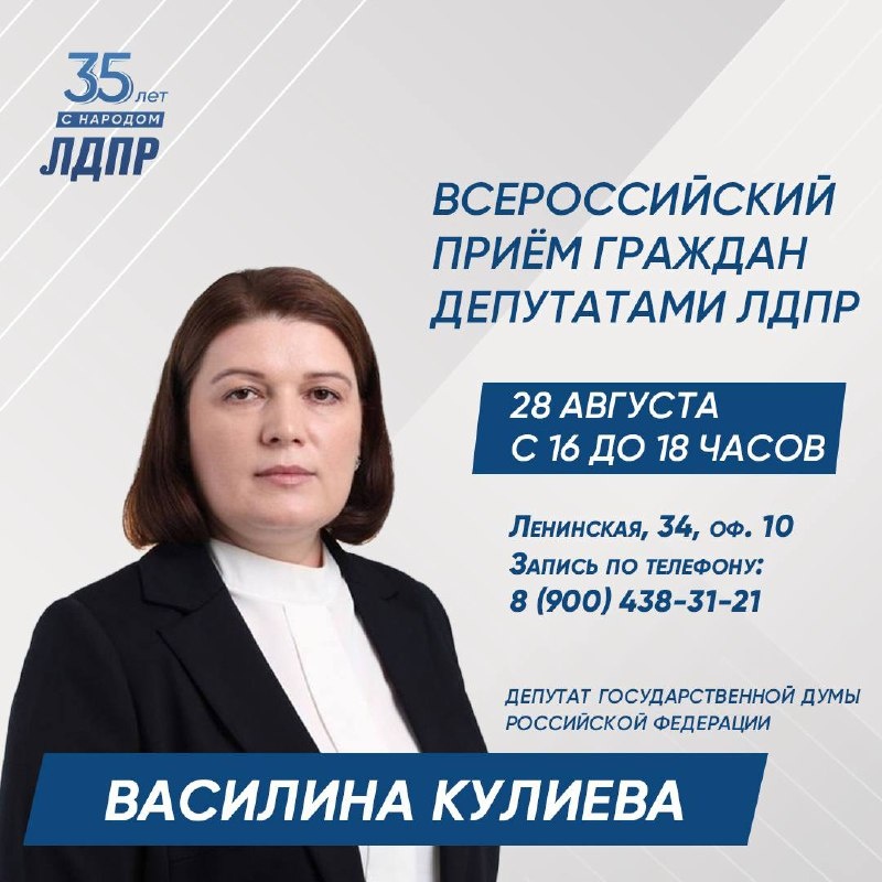 Попасть на прием к депутату Государственной Думы могут жители Камчатки Приём состоится с 16:00 до 18:00 часов. Обязательна предварительная запись по телефону: 8 900 438-31-21 Приходите и расскажите о вашей проблеме! #ЛДПР #ЛДПРКамчатка #ПриёмГраждан #Кулиева #ГосударственнаяДума