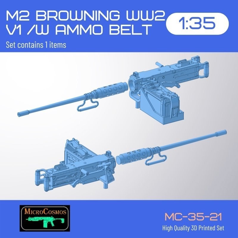 3D MicroCosmos из Греции выпустила на 3D-принтере модель пулемета Второй мировой войны M2 Browning в масштабе 1/35: M2 Browning WW2 V1/with ammo belt (каталожный номер МС-35-21)