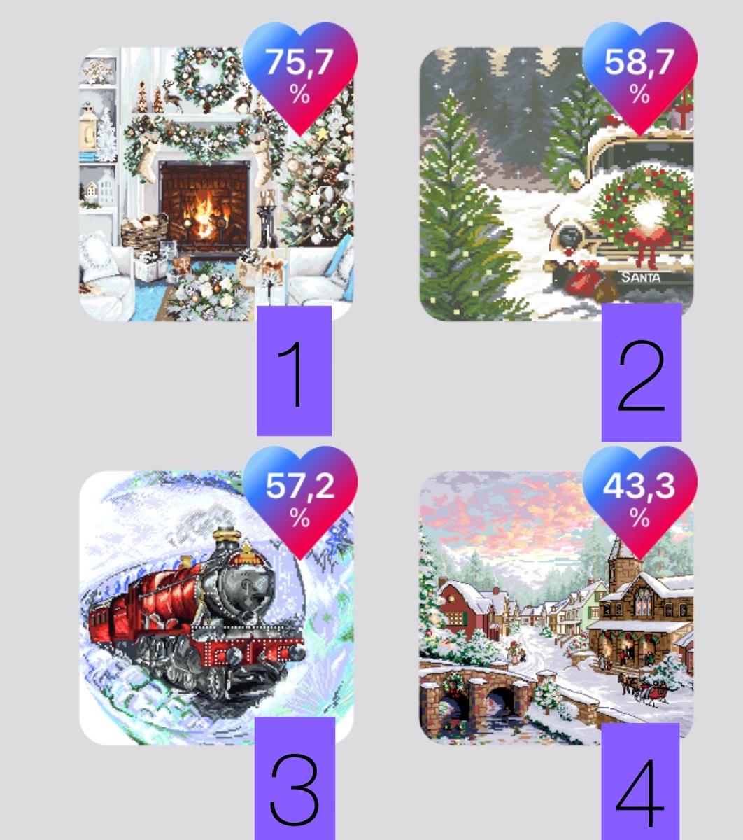 Всем привет) Наступила среда, а это значит, что вы снова можете повлиять на то, что я буду вышивать на выходных. 🛑стоп🛑 в комментариях объявлю в пятницу. На этой неделе игроки неизменны: 1- «Рождественский интерьер» от Luca’s 2- «Новогодняя машина» от Панны 3- «Лунный поезд» от Андрианы 4- «Рождественская деревенька» от Dimensions Выбор за вами 💙