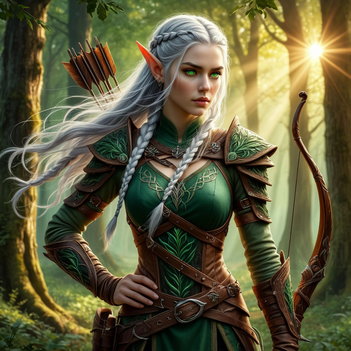 > `masterpiece, best quality, a beautiful elven archer with long silver hair and emerald green eyes, intricate braids, pointed ears, wearing a leather armor adorned with forest motifs, determined expression, holding a glowing bow, standing in an ancient sunlit forest, rays of light through the canopy, photorealistic, digital painting, epic fantasy art, by Artgerm and Greg Rutkowski --ar 2:3`