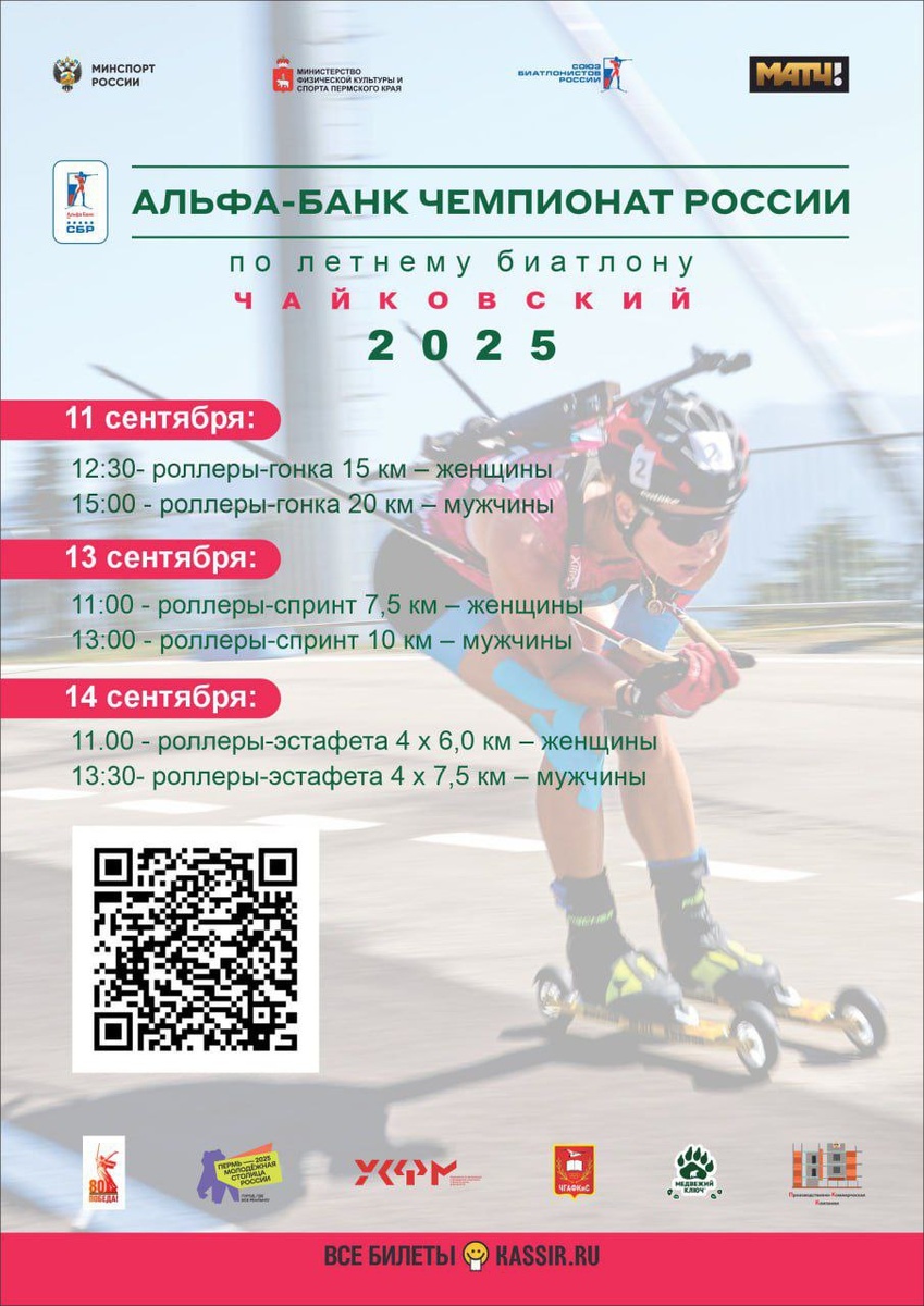 Альфа-Банк Чемпионат России по биатлону на роллерах Спортивные соревнования пройдут с 11 по 14 сентября в Чайковском Захватывающее событие соберет лучших спортсменов страны, которые будут соревноваться в различных дисциплинах. В программе заявлены роллеры-гонки, роллеры-спринты и роллеры-эстафеты. Место проведения чемпионата - лыжно-биатлонный комплекс Федерального центра подготовки по зимним видам спорта «Снежинка» им. А.А. Данилова ФГБОУ ВО «ЧГАФКиС». Это современное спортивное сооружение обеспечит всем участникам и зрителям комфортные условия для соревнований. Приглашаем всех болельщиков поддержать любимых спортсменов и насладиться атмосферой спортивного праздника! Билеты можно приобрести онлайн http://vk.cc/cP0oXp Бесплатный вход для детей дошкольного возраста, учащихся школ, учащихся средних и высших учебных заведений, пенсионеров, участников СВО и их семей, людей с ограниченными возможностями. Мероприятие реализуется при поддержке Министерства спорта России, Правительства Пе