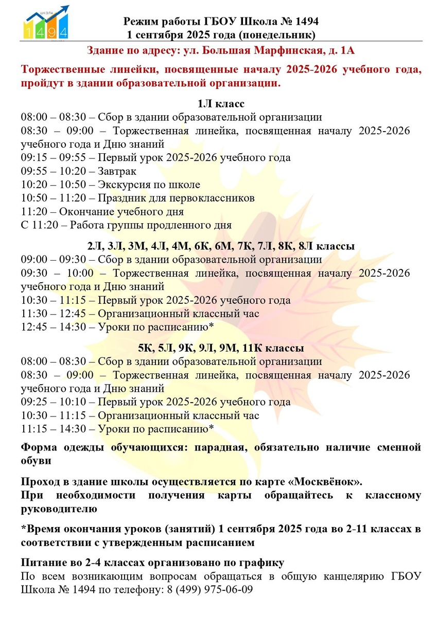 📊Режим работы 01 сентября 2025г.🍁 📢Уважаемые родители, обучающиеся! ✔️Обратите внимание на режим работы нашей школы в День знаний! 🤗Школа с нетерпением ждет своих учеников 01 сентября 2025г! ❓По всем возникающим вопросам Вы можете обратиться в канцелярию школы по телефону:☎️ 8 (499) 975-06-09 #ДОНМ #ШколыКолледжиМосквы #ГБОУШкола1494 #СВАО #МРСД5