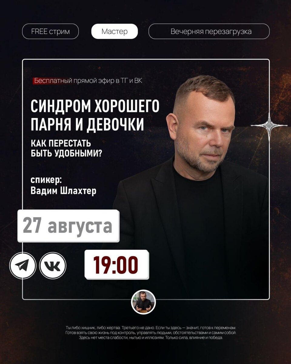 🔴🔴🔴🔴🔴 Бесплатный стрим «Синдром хорошего парня и девочки». Задавайте свои вопросы по теме в комментариях к этому посту — на все отвечу в прямом эфире. ⏳ 27 августа в 19:00 (длительность до 30 минут) 🕙 Подключайся в Телеграме или Вконтакте. Я провожу «Вечернюю перезагрузку» каждую среду. Запись эфира выложу в частном канале. Обо мне | Благодарность команде | Навигация