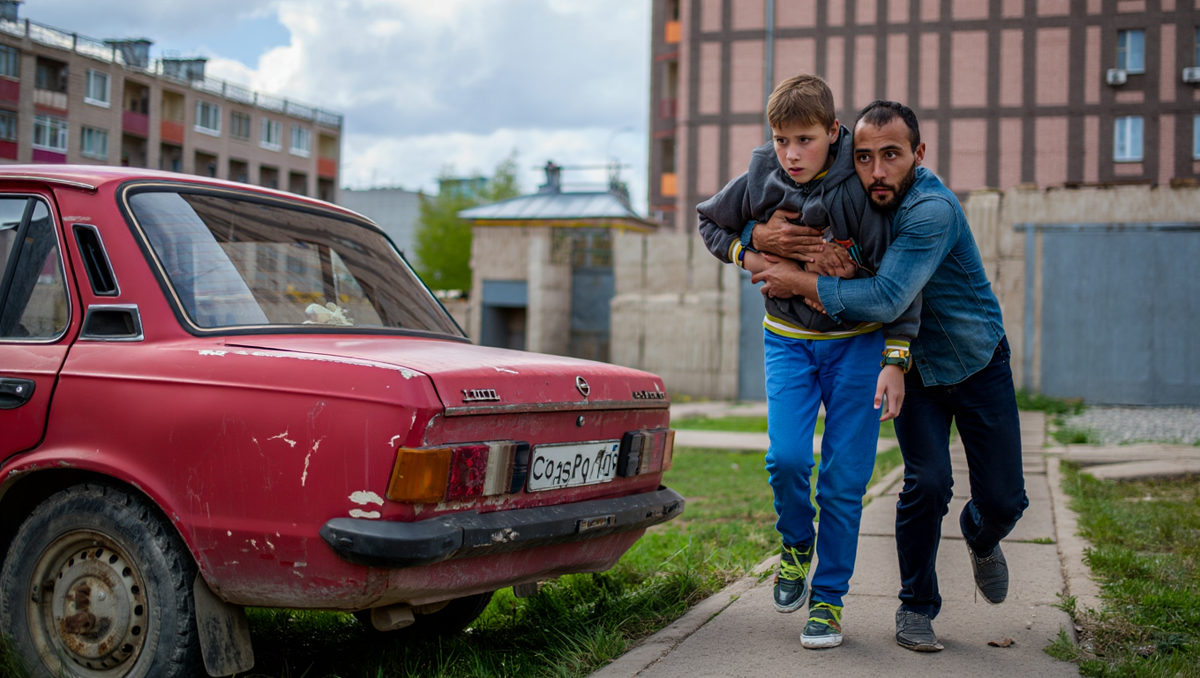 Артем, почувствовав опасность, начал вырываться. Его рюкзак соскользнул с плеча, а куртка затрещала по швам, когда Мастурбек с силой тянул его к машине. Мальчик закричал: «Помогите! Меня уводят!» Его голос разнесся по улице, заставив прохожих обернуться. Двое мужчин, проходивших мимо, — один в строительной каске, другой с пакетом из магазина — бросились на помощь. «Отпусти пацана!» — крикнул один из них, крепкий парень лет тридцати, сжимая в руке металлическую трубу, которую нашел у забора.