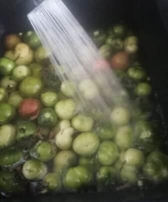 Кто то чтоб урожай не пропал, кто то из за того что самому нравиться закусить зелеными помидорами солят зеленые помидоры. Самым вкусным получается соленые холодным способом. Благодаря такому способу плоды не теряют своих вкусовых качеств и ценных элементов. В зеленых томатах содержатся обилие витамин и минералов, которые так нужны нашему организму. Для засолки особенно подходят такие сорта «Розовый мед», «Медовая капля» и «Царь-колокол». Состав: Для рассола на 1 л воды: Сначала готовим необходимые продукты. Можно использовать как зеленые томаты, так и те, которые уже начали немного спеть. Удаляем плодоножку и хорошо моем томаты в чистой проточной воде. Так как будем солить в ведре (тару сначала моем посудомоечном средством, хорошо ополаскиваем, а затем моем еще раз с содой) , а его стерилизовать проблематично, и поэтому помидоры, зелень и тара, в которой будет происходить засолка, должны быть максимально чистыми. Листья хрена моем и стряхиваем, ните от остатков воды. Чеснок чистим