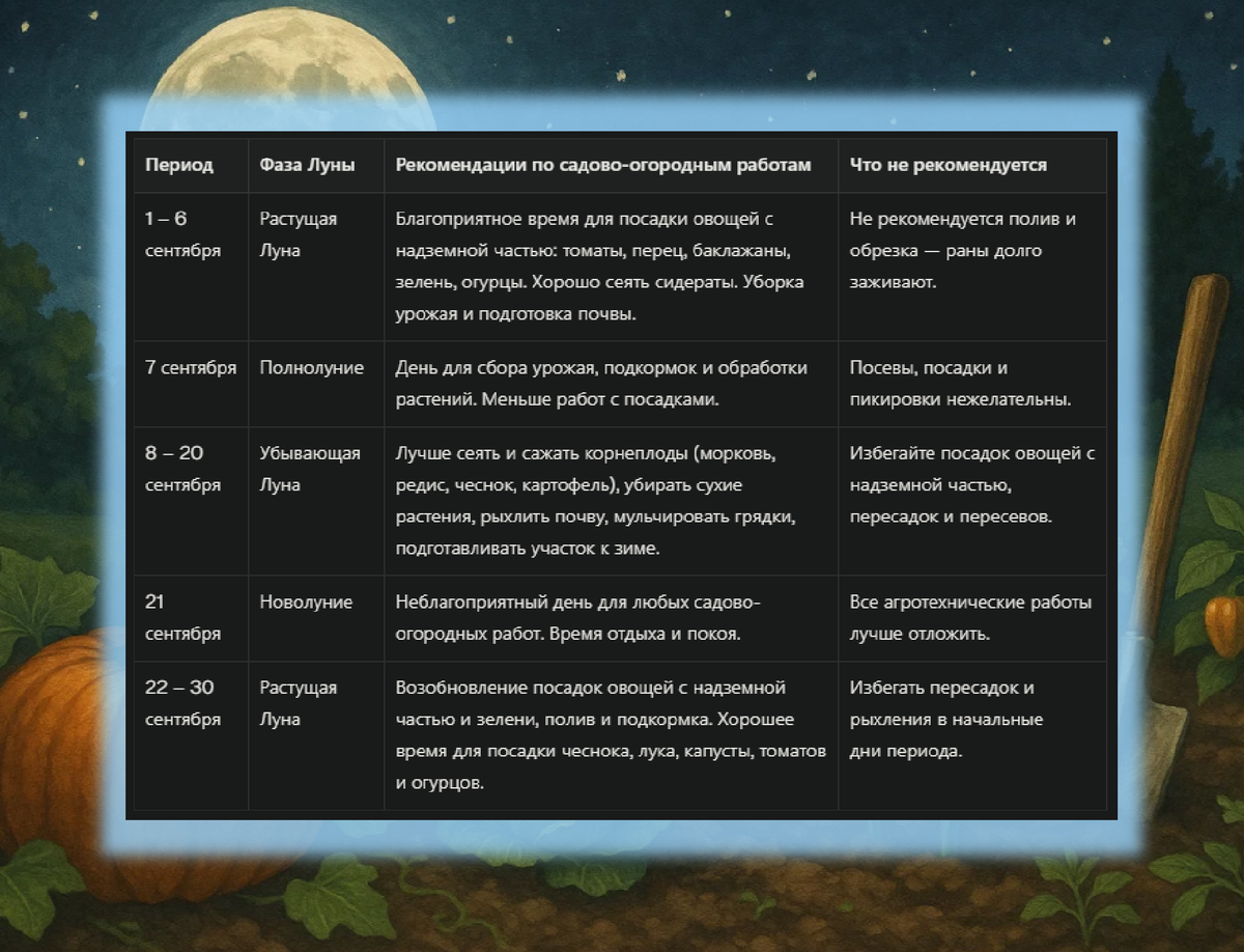 Составьте простой рабочий план, сверяясь с актуальным лунным календарем. В сентябре в приоритете уборка культуры, посадка озимых, обработка почвы, обрезка, посадка рассады для ранней весны и заготовка черенков. Перечислим основные шаги и рекомендации, которые помогут вам достичь максимальных результатов.