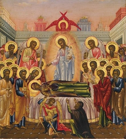 Настал третий час, когда должно было совершиться Успение Божией Матери. Пылало множество свечей. Святые апостолы с песнопениями окружали благолепно украшенный одр, на котором возлежала Пречистая Дева Богородица. Она молилась в ожидании Своего исхода и пришествия Своего вожделенного Сына и Господа. Внезапно облистал неизреченный Свет Божественной Славы, пред Которым померкли пылавшие свечи. Видевшие ужаснулись. Верх помещения как бы исчез в лучах необъятного Света, и сошел Сам Царь Славы, Христос, окруженный множеством Ангелов, Архангелов и других Небесных Сил с праведными душами праотцев и пророков, некогда предвозвещавших о Пресвятой Деве. Увидев Своего Сына, Божия Матерь воскликнула: "Величит душа Моя Господа, и возрадовася дух Мой о Бозе, Спасе Моем, яко призре на смирение рабы Своея" - и, поднявшись с ложа для встречи Господа, поклонилась Ему. Господь приглашал Ее в обители Вечной Жизни. Без всякого телесного страдания, как бы в приятном сне, Пресвятая Дева предала душу в руки Своего Сына и Бога.