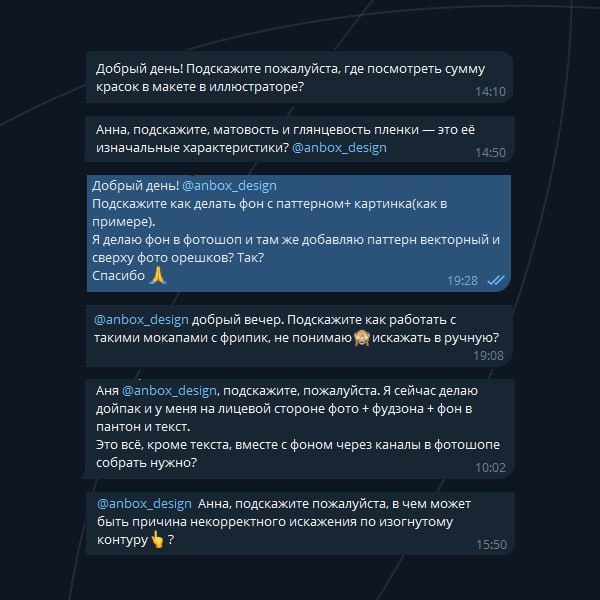 🔥🔥На каждом потоке курса я собирала для студентов отдельный чат с полезными видео и ответами на вопросы студентов: туториалы по Photoshop и Illustrator, разборы домашних заданий, нюансы предпечатки - все, что собралось за годы практики и преподавания. Со временем этих видео стало так много, что они оказались разбросаны по чатам — и найти что-то нужное было почти невозможно. Для удобства, мы собрали всю базу в удобный телеграм-бот — с темами и поиском по ключевым тегам. Все новые видео будут добавляться в этот бот. ❕Ссылка на бот Честно говоря, такие подборки обычно продают как отдельные интенсивы, но я решила сделать доступ открытым для всех 🖤🤍C вас - поделиться со знакомыми дизайнерами, для этого в боте есть отдельная кнопка) Если вы ещё не знакомы с тем, как я даю обратную связь , загляните в бота — это наглядный пример. P.S на ближайший поток курса осталось последнее место, успейте присоединиться