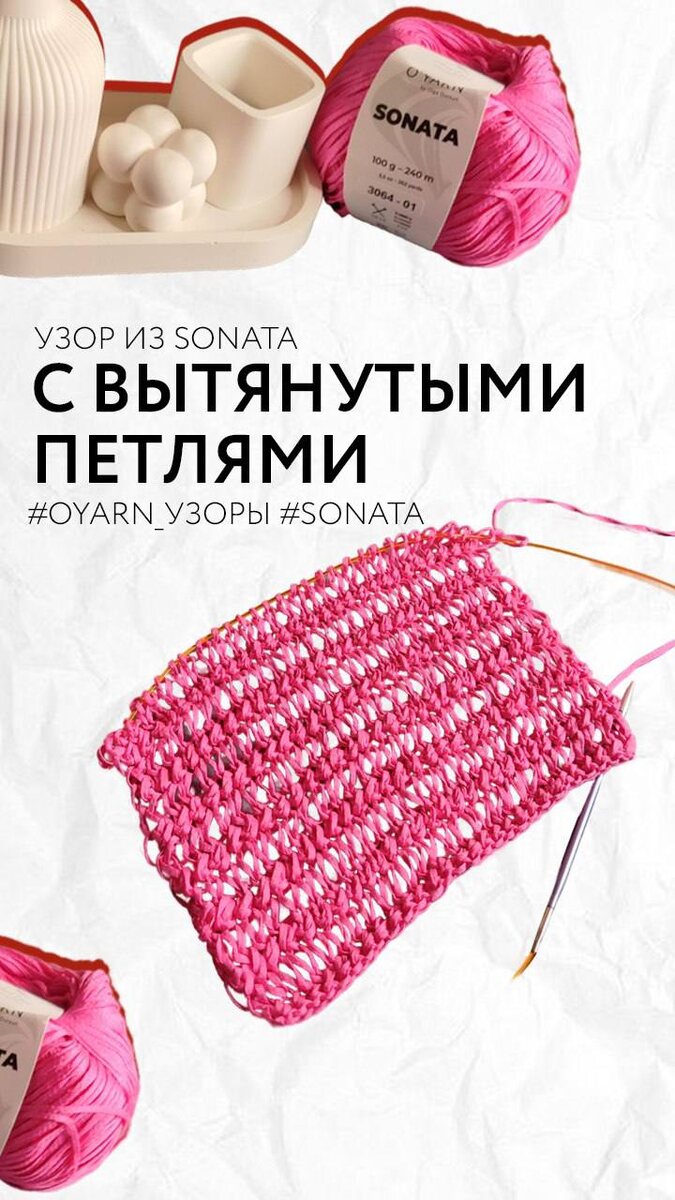 УЗОР С ВЫТЯНУТЫМИ ПЕТЛЯМИ из SONATA Продлеваем лето ☺️🥰 Продолжаем делиться узорами от нашей Виктории @vaisg ❤️ на этот раз узор для того самого жакета из SONATA! (Ищите по хэштегу: #sonata_жакет) Узор с вытянутыми петлями раскроет летнее настроение в любом изделии, а главное: придаст изюминку вашему шедевру! Рапорт узора при поворотном вязании состоит из 4 рядов. Данный образец связан из артикула SONATA 💥 👉 Состав: 100% мерсеризованный хлопок 👉 Метраж: 240м/100г 👉 Ширина ленты: 2мм 👉 Цвет: 3064 👉 Спицы: 4,5мм Все узоры ищите по тэгу: #oyarn_узоры O’YARN - вязаное лето 😍 Вяжем лето вместе! ПРИОБРЕСТИ SONATA #oyarn #оярн #пряжа_оярн #sonata В этом посте есть большое видео, которое не загрузилось в Дзен. Откройте оригинал поста в телеграме, чтобы его посмотреть