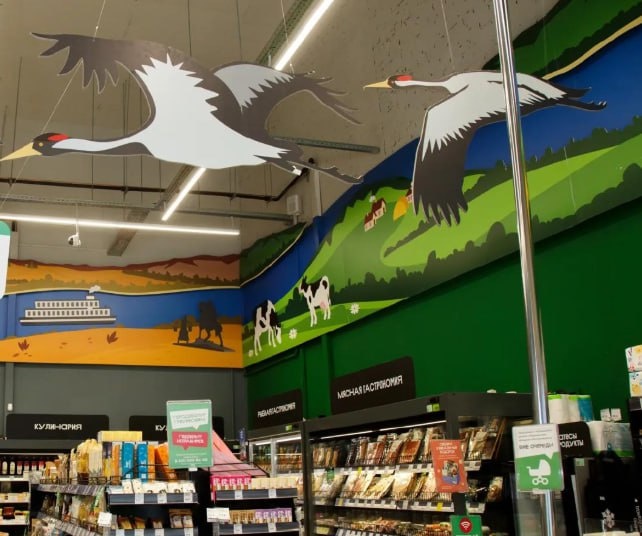 Позитивные эмоции и радость — продают. На днях наткнулся на интересный пример оффлайн-коммуникации в магазинах ВкусВилл и подумал, что это отличный кейс, чтобы показать, как эмоциональный маркетинг работает в реальности. И это не просто моё мнение — об этом говорят реальные отзывы покупателей. Что сделали во ВкусВилл? Открыли несколько магазинов и сделали уникальный дизайн под каждый город. В Ростове, например, концепция «Сезоны реки Дон»: на потолке подвешены изображения журавлей, цветовая гамма мягкая, почти народная, а на стенах — речные пейзажи Дона. Люди заходят и чувствуют атмосферу города. В Красногорске — «Продукты-суперзвёзды»: Лана Сельдерей, Пол Маккарони, Сметалика — мне кажется это очень прикольным, над чем можно посмеяться и поделиться с друзьями. В Долгопрудном тематика «Великие свершения». В оформлении — лауреаты Нобелевской премии, которые связаны с университетом МФТИ, который находиться рядом с магазином. А в Санкт-Петербурге применили концепцию «Исторический ры
