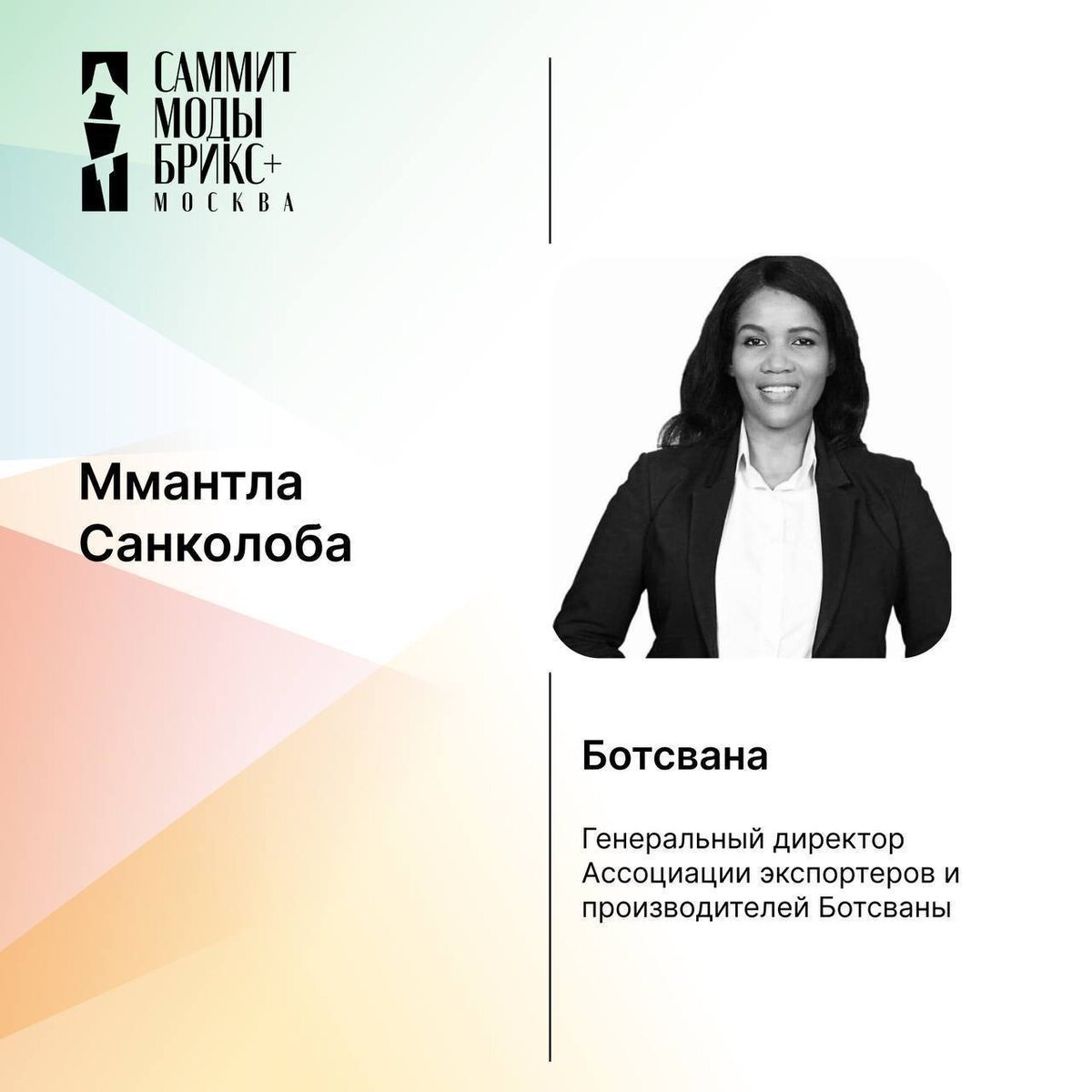 Сессия деловой программы BRICS+ Fashion Summit «#Региональная сессия. Африка» пройдёт 28 августа в 18:00. (Зал «Большой») Модератор сессии: основатель Hub of Africa Fashion Week Махлет Теклемариам. Спикеры сессии: генеральный директор Ассоциации экспортеров и производителей Ботсваны Ммантла Санколоба, член правления и генеральный секретарь Египетского совета моды и дизайна Сьюзан Сабет, основатель и генеральный директор Академии и лаборатории моды Mafi Махлет Афворк, генеральный директор Недели моды в Аккре Нана Тамакло, основатель & CEO Sea Design Lab Неделя моды Туниса Анис Монтасер. Попасть на деловую программу BRICS+ Fashion Summit (Саммит Моды БРИКС+) могут все желающие по предварительной регистрации на официальном сайте.
