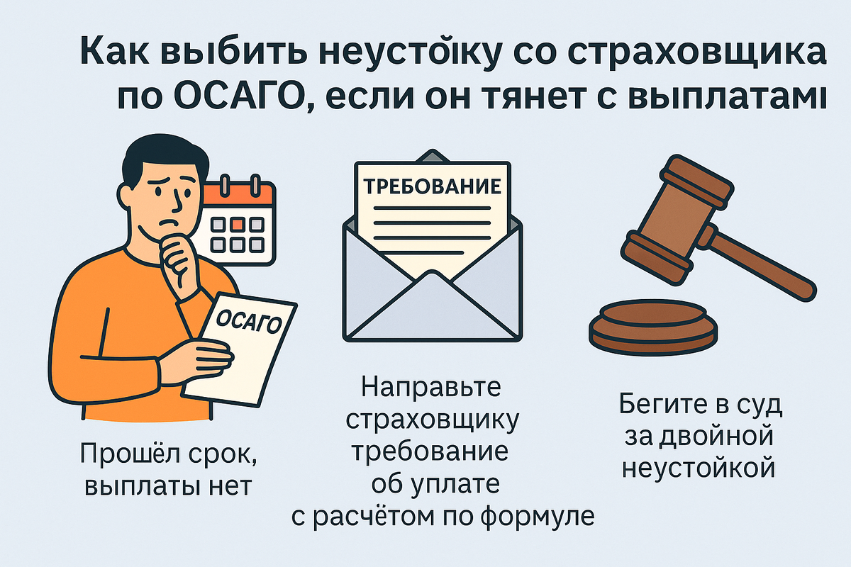 Столкнулись с ситуацией: ДТП произошло, документы собраны, а страховая компания тянет время? По закону она обязана платить неустойку за каждый день просрочки. Рассказываю, как её взыскать. Страховая должна заплатить, если нарушает: ⚖️ Если компания опоздала — с 21-го или 31-го дня начинает капать неустойка. Пример: вам должны 200 000 ₽, страховая задержала 10 дней. Неустойка — 20 000 ₽. Важно: максимальная сумма ограничена — 400 тыс. руб. за имущество и 500 тыс. руб. за вред здоровью. Берём сумму, которую должна страховая, и считаем проценты за каждый день задержки. Укажите сумму, банковские реквизиты и требование выплатить неустойку. Это обязательный досудебный шаг. Если страховая не платит или отказала, можно пожаловаться финансовому омбудсмену. Его решение для страховщика обязательно. Если и это не помогло — идём в суд. Иск можно подать по месту жительства или по адресу страховой. Госпошлину платить не нужно, если сумма иска до 1 млн рублей. С ним можно идти напрямую в банк или к су