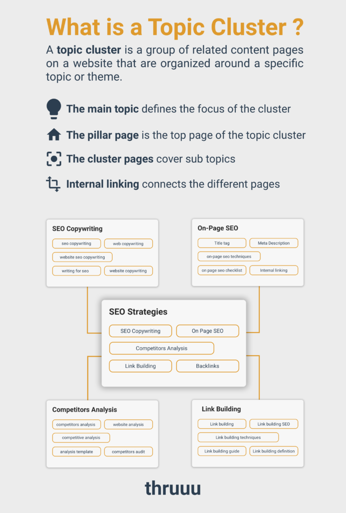 После того как вы определились с основной темой и изучили связанные с ней вопросы, настало время создать кластеры по темам и ключевым словам. Кластеры – это эффективная техника в SEO, которая позволяет структурировать контент сайта. Чтобы публиковать большое количество контента, стоит сгруппировать связанные подтемы и их ключевые слова в кластеры.