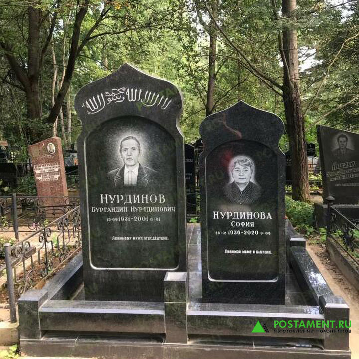 В компании "Постамент" за два месяца был создан величественный мусульманский мемориальный комплекс из черного гранита Габбро-Диабаз, предназначенный для обустройства семейно-родового захоронения. Комплекс обрел своё вечное пристанище на Митинском кладбище. Над могилой, словно стражи памяти, возвышаются два гранитных монумента, разных по высоте, украшенные арочными нишами. В глубине этих ниш, словно застывшие мгновения, выгравированы портреты и надписи, выполненные с помощью лазерного гравера пятого поколения с ЧПУ, с филигранной точностью передающие черты ушедших. Фигурное навершие памятников, как будто устремленные ввысь молитвы, вырезаны в форме куполов-гамбизов, напоминающих изящные минареты мечети. Каждая деталь, каждый изгиб были созданы с помощью роботизированного фрезерного станка с ЧПУ, обеспечивающего безупречную четкость и плавность линий. В соответствии с древней традицией, лицевая сторона стел обращена на восток, в сторону священной Мекки. Мусульманские памятники, отличающи