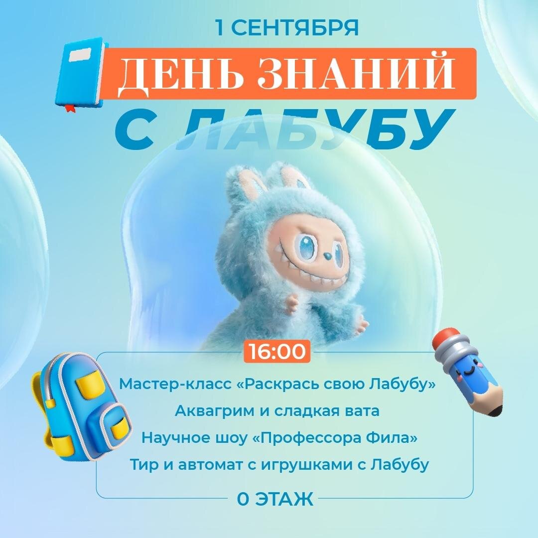 ➡️ День знаний с Лабубу в ТРЦ «Щёлковский»! 1 сентября | Щёлковское ш., 75 Расписание: 🍬 16:00 — 20:00 — Анимационная программа «Тренды 2025», мастер-класс «Раскрась свою Лабубу» (до 100 человек), бесплатные аквагрим и сладкая вата, тир и автомат с игрушками с Лабубу 👨🔬 17:00 – 18:00 — Научное шоу «Профессора Фила». Зрелищные эксперименты и открытия, которые доказывают — наука — это не скучно, а очень интересно 🕹 18:00 – 19:00 — Интерактив с плазменным экраном: квиз на тему 1 сентября, модные челленджи и задания для самых активных 🪩19:00 – 20:00 — Финальная дискотека и танцевальные баттлы вместе с героями праздника 🧷 Бесплатная Москва
