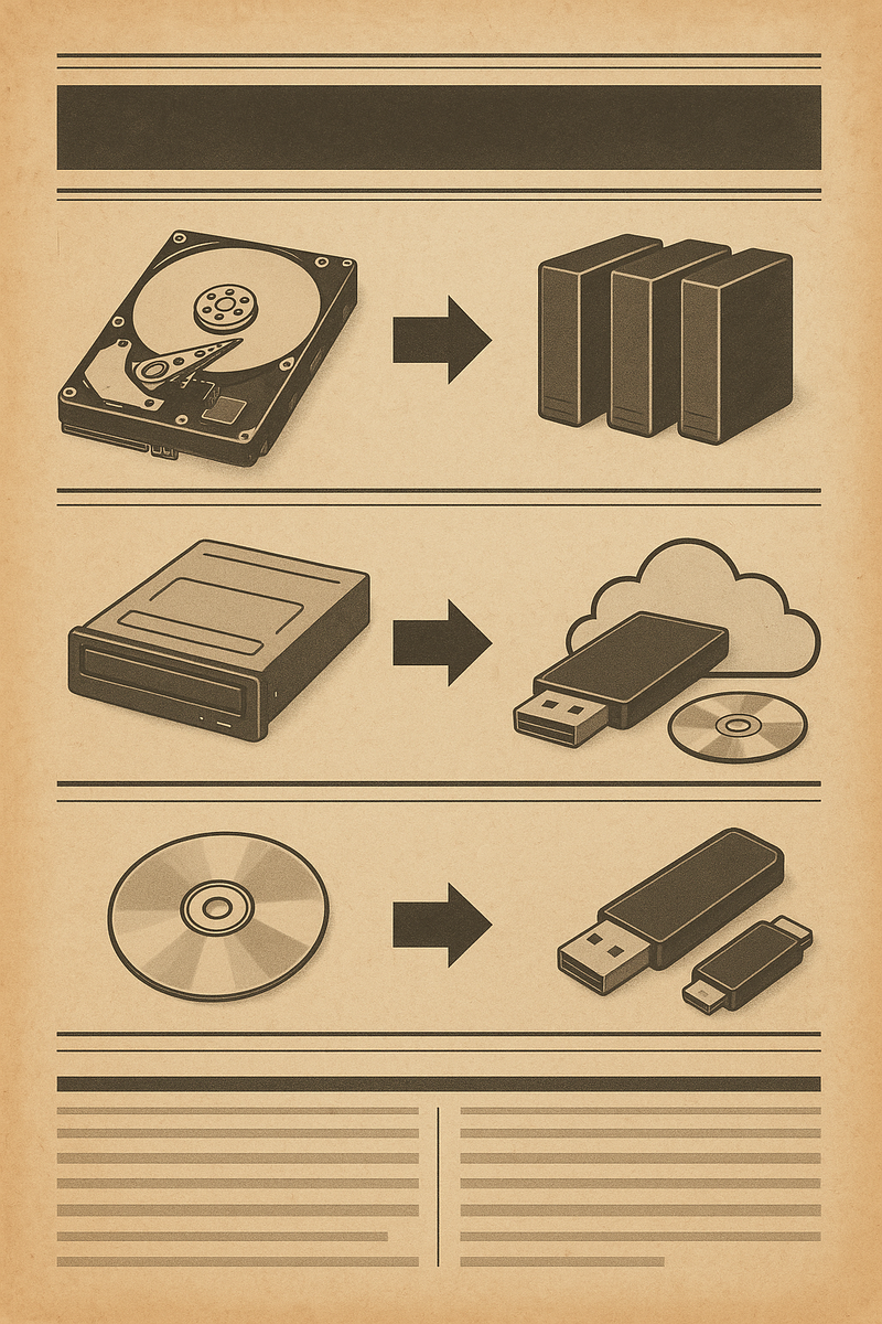 В конце 90-х годов компьютерные журналы рассуждали о том, какие устройства хранения информации лучше всего подойдут пользователю. В статье тех лет можно встретить строки: «Для решения практических любых задач вполне достаточно установить пару жёстких дисков ёмкостью 3,2 ГБ». Сегодня подобная фраза звучит почти как шутка. Современный смартфон «среднего класса» имеет 128–256 ГБ встроенной памяти, а жёсткие диски для настольных ПК начинаются с 1–2 ТБ (1000–2000 ГБ). То, что считалось «избыточным» в 1998-м, теперь даже не подходит для хранения пары современных игр. В статье также приводилась «мечта»: «Современные устройства CD-ROM работают в несколько раз быстрее, чем их предшественники… Новейшие диски CD-DVD могут содержать более 17 ГБ данных». CD-ROM действительно были стандартом, но сегодня они ушли в историю. DVD и Blu-Ray на короткое время стали важным этапом (4,7–50 ГБ на диск), однако их вытеснили флеш-накопители, SSD и облачные сервисы. Хранение информации теперь измеряется тераба