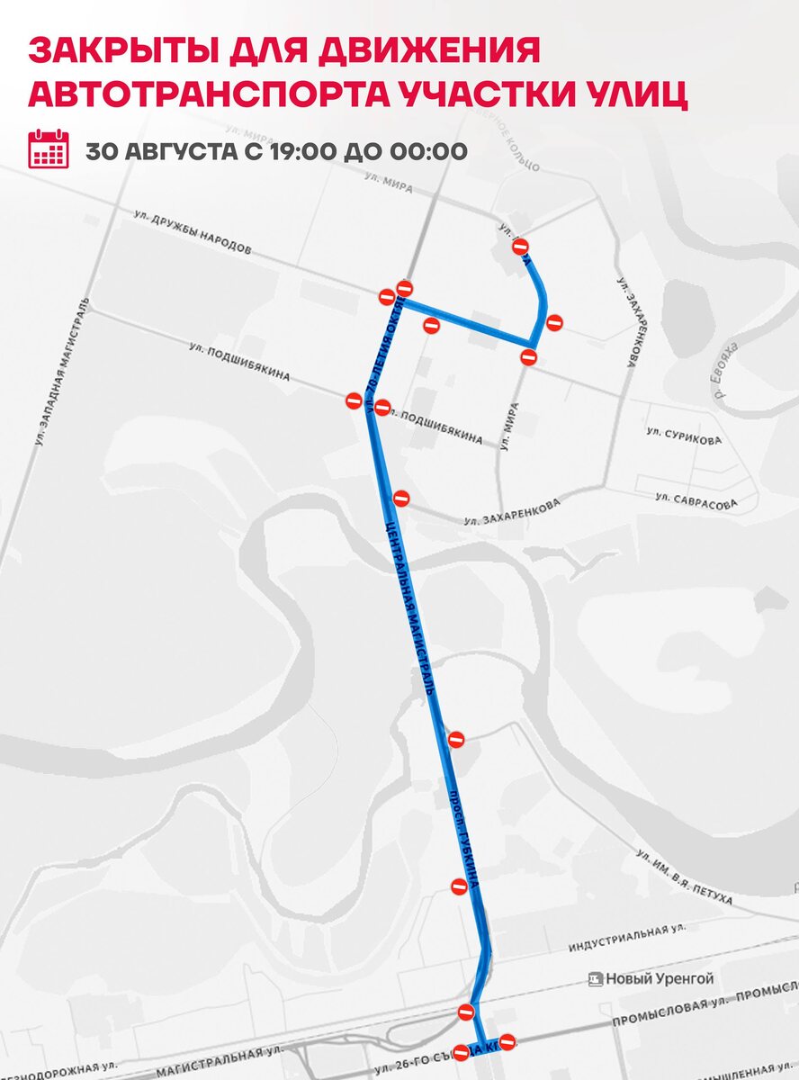 ❌ ВАЖНО: о перекрытии В связи с проведением велозабега и забега «Разбуди Ямал» 30 августа с 19:00 до 00:00 будут закрыты для движения следующие участки дорог: — улица Мира (от Приполярной до улицы Дружбы Народов); — улица Дружбы Народов (от улицы Мира до 70-летия Октября); — улица 70-летия Октября (от Дружбы Народов до улицы Подшибякина); — улица Центральная магистраль (от Подшибякина до улицы имени В.Я. Петуха); — проспект Губкина (от улицы имени В.Я. Петуха до 26 Съезда КПСС); — развязка №2 и №4; — улица 26 Съезда КПСС (от дома №6А до дома №8). Объехать можно по улицам Мира, Приполярной, имени Сабита Оруджева, Захаренкова, имени Константина Ватолина, Магистральной, Юбилейной, Геологоразведчиков, Западная магистрали и по Ленинградскому проспекту. Планируйте маршрут заранее! ❤️ НУР. Официально