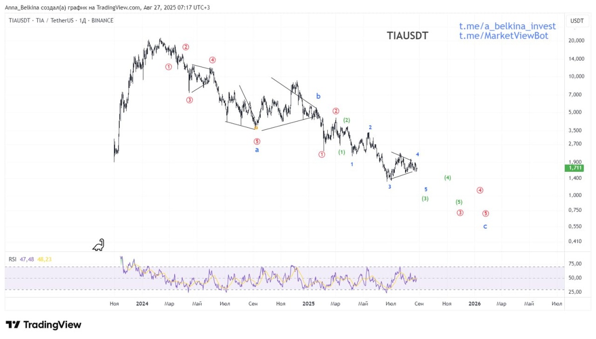 #TIA Полагаю движение в виде одинарного зигзага, в котором ставится волна с. Волна с зигзага пока выглядит довольно импульсно. Приоритет на продолжение падения. Не является ИИР 💪 Бот Закрытого Канала (подписаться из-за границы, пишите личным сообщением