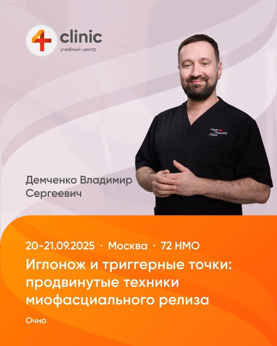 Приглашаем вас на уникальный двухдневный интенсив с Владимиром Демченко 😎 Этот курс – не просто обучение, это глубокое погружение в мир лечения, где вы получите не только теоретические знания, но и отточенные практические навыки безопасного и максимально эффективного применения иглоножа. Мы сфокусируемся исключительно на практике❗️ Акцент будет сделан на: ✅ Мастерство Иглоножа: От основ до продвинутых техник – вы освоите каждый аспект работы с этим мощным инструментом. ✅ Уникальные протоколы и личные наработки Владимира Демченко ✅ Вы научитесь не просто находить, а устранять триггеры и мышечные боли в любой области тела. 📌Дата: 20-21 сентября г. Москва Форма обучения: Очное участие Регистрация на курс!