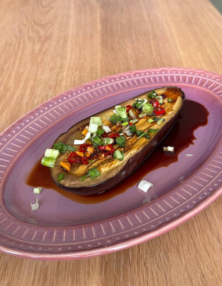 2 баклажана Растительное масло Соевый соус 1 перчик чили 5 зубчиков чеснока Зелёный лук Баклажаны режем пополам, смазываем маслом и отправляем в духовку - 190° 25-30 минут. В это время смешиваем соевый соус с перчиком чили (держим в перчатках, режем ножницами сразу в тару. Это можно есть, но не трогать. Не трогать!). Туда же мелко режем (режем, не давим!) 5 зубчиков чеснока. Сиё великолепие выливаем на готовые баклажаны, сверху посыпаем зеленым луком. Едим сердцевину, кожуру оставляем на тарелке. Попробуете? #рецепты