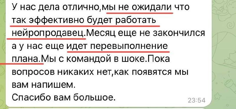 В ответ на пост План продаж перевыполнен 😳 Клиент дал обратную связь после внедрения продавца. Уже в первый месяц после внедрения ИИ-сотрудника перевыполняют план по продажам🔥 Приятно осознавать, что твоя работа приносит пользу. Это очень круто мотивирует💪 Кстати, после внедрения ИИ-сотрудника мы с командой еще сопровождаем клиента до 3 месяцев бесплатно в рамках договора или заключаем новый договор на постоянное ведение. На этом этапе мы: - следим за корректностью работы ИИ-сотрудника - исправляем возникающие неточности - дообучаем его изменениям, которые происходят в компании клиента (цены, условия, ассортимент и прочее) Так что это вам точно не «бота собрать», а серьезная работа, направленная на повышение эффективности и увеличение прибыли в бизнесе. При этом для бизнеса это до 10+ раз выгоднее, чем делать ту же работу руками менеджеров. Для заказа такого продавца для своего бизнеса, пишите в личку.