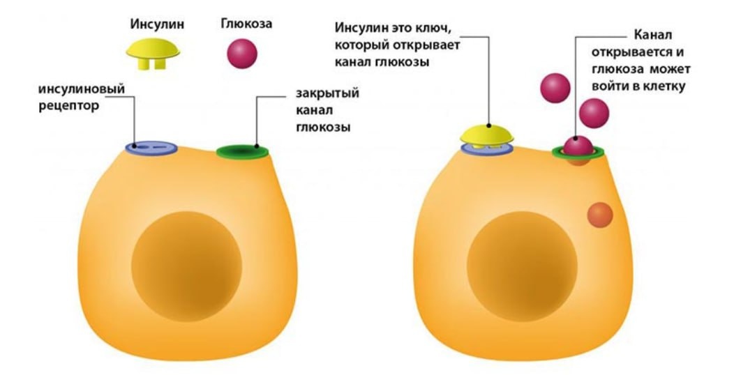 Знаете, что гораздо важнее, чем подсчет калорий? Частая история - вы вроде бы исключили сладости, пьете капучино без сахара, выбираете "полезные продукты", пробуете разные диеты… А стрелка весов всё равно упорно не двигается вниз. Очень часто причина — в высоком инсулине. Поэтому нужно разобраться, есть ли у вас с ним проблемы. В норме всё работает так, как на картинке: 1️⃣ Мы едим → сахар в крови слегка повышается. 2️⃣ Поджелудочная выбрасывает инсулин — он как "ключик" открывает двери в клетки. 3️⃣ Глюкоза заходит внутрь и превращается в энергию. Инсулин выполнил свою задачу и ушёл. Но что происходит у большинства? Питание "нон-стоп": каша на завтрак→ кофе с шоколадкой в офисе → обед → банан на перекус→ ужин. Сахар в крови постоянно поднимается, а инсулин вынужден без конца "стучаться" в клетки. ❓Что мы делаем, если наши дети безостановочно кричат "маам.."? Правильно, мы в какой-то момент перестаем их слушать. Вот так же и клетки перестают реагировать на постоянно высокий инс