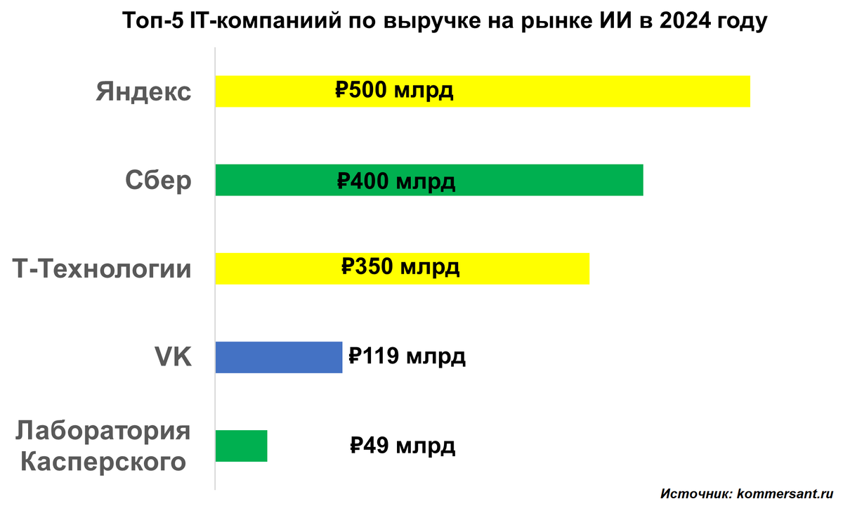 Рынок ИИ в России, по данным Smart Ranking, растёт бодро - плюс 25-30% в год, до почти 1,9 трлн рублей. Но есть нюанс: 95% выручки у пяти игроков - Яндекс, Сбер, Т-Банк, VK и "Лаборатория Касперского". Остальные - на подхвате, пишет КоммерсантЪ. Формально - впечатляюще. Фактически - перед нами не рынок, а клуб элитных держателей серверных мощностей, больших данных и бюджетов на миллиардные эксперименты. У Яндекса ИИ - это часть экосистемы сервисов. У Сбера - драйвер внутренних процессов (эффект 450 млрд руб. в 2024-м). У Т-Банка - очевидная ставка на финтех и биометрию. У VK - персонализация и маркетинг. У "Касперского" - безопасность и автоматизация. То есть для всех топ-5 ИИ - не отдельный бизнес, а смазка для основных механизмов. И тут возникает вопрос: что именно мы считаем "рынком ИИ"? Если считать каждую ML-модель в экосистеме, то цифры получаются триллионные. Если же брать "чистое ПО и сервисы" - оценки падают в десятки раз (MWS AI говорит о 50 млрд руб. всего). В США доминируют