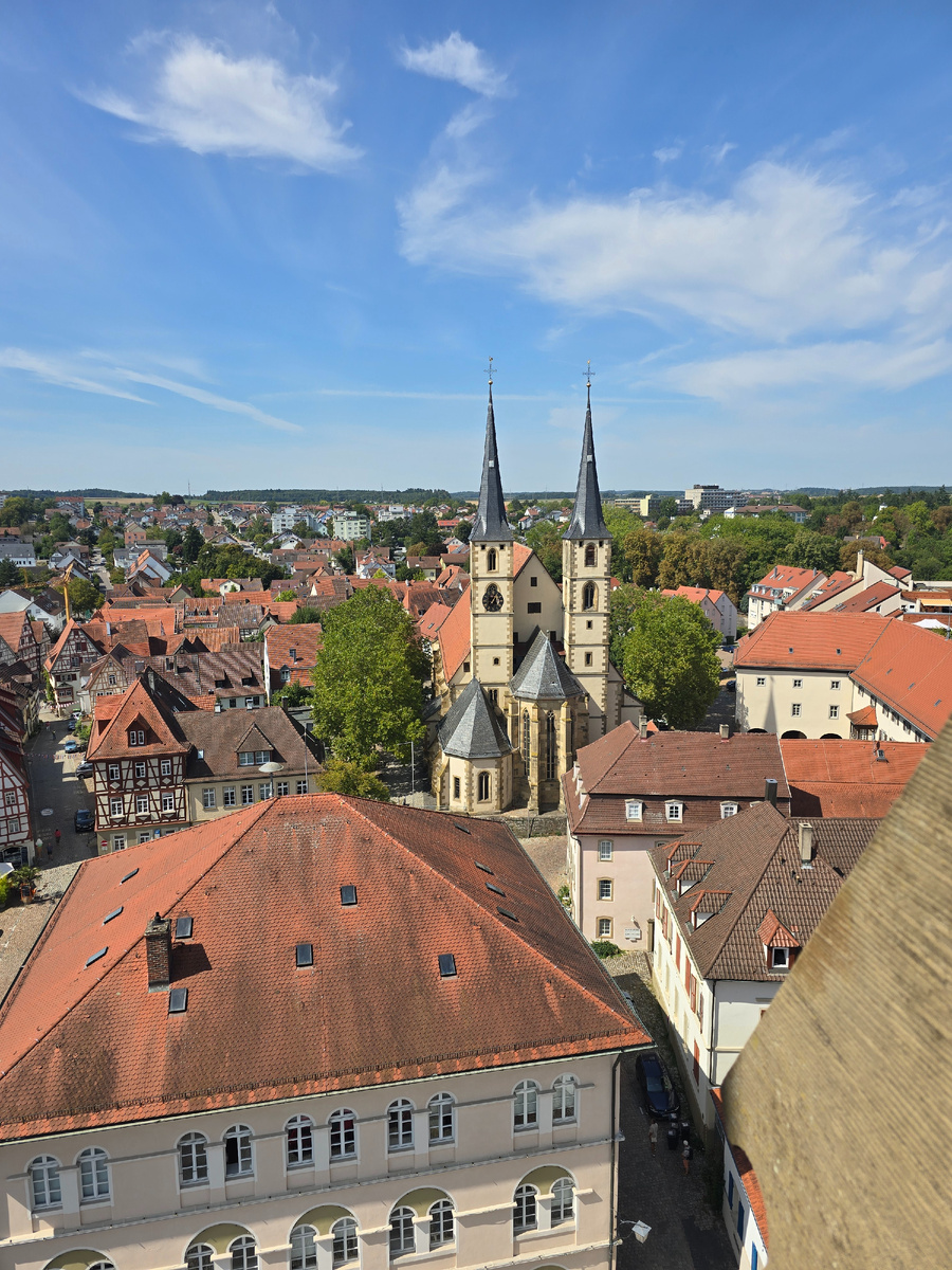 Город красивый, ощущение ,будто погружаешься в сказку братьев Гримм. Кажется, что именно из окна одного из домов героиня одной из сказок варила кашу, и каша потом разливалась по этим улочкам. Город как будто сохранился со времён средневековья, в центре нет ни намёка на современность. Приятно сидеть в кафейне, пить кофе и слушать шум воды из фонтана, которому уже несколько сотен лет. Мы поднялись на Голубую башню. Вид сверху просто потрясающий: крыши домов, церковь с высокими шпилями и зелёные поля, уходящие к горизонту. Внутри башни стоит старый колокол 1851 года — он расплавился во время пожара 1984 года и упал вниз. Теперь его можно увидеть, как часть истории. В городе есть ещё Красная башня — более строгая, но тоже красивая. Просто идёшь по улочкам, и вдруг перед тобой вырастает она. А сами улочки и дворики в Bad Wimpfen — это отдельное удовольствие. Каменные стены, фахверковые дома, узкие проходы. Всё дышит историей. После прогулки мы заглянули в пекарню. Свежие булочки, за