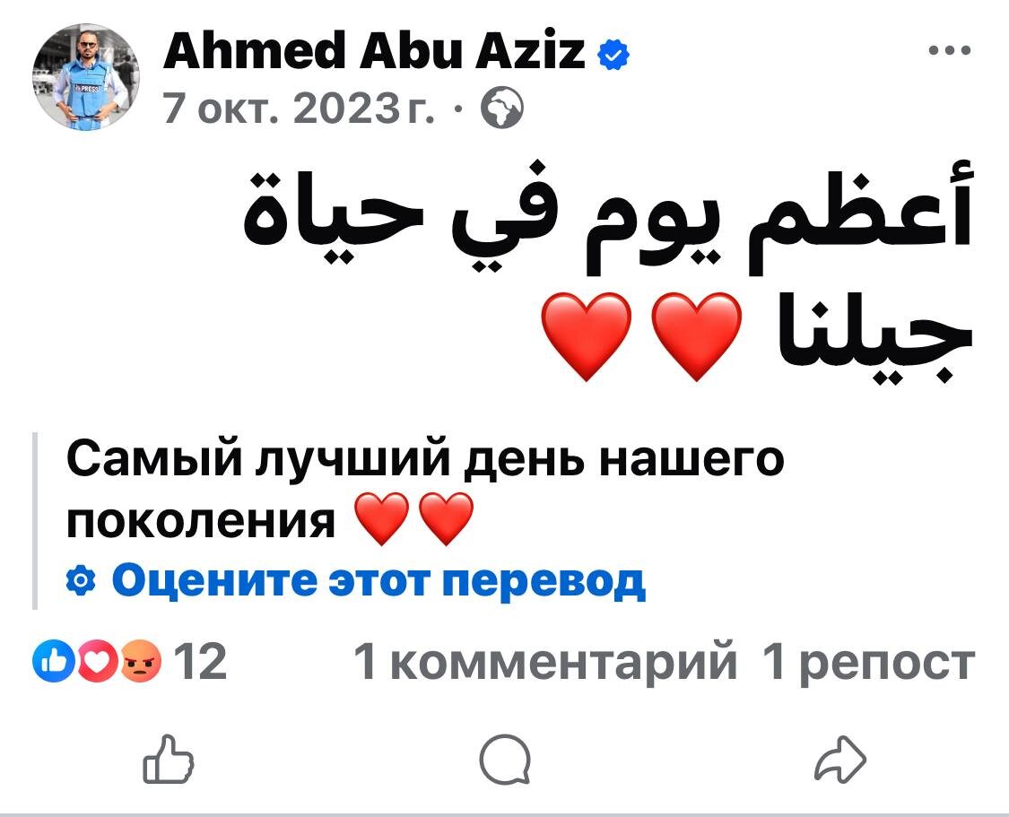 По поводу «журналистов» в Газе. Прежде чем раздавать титулы палестинцам в синих жилетах, стоит хотя бы открыть их соцсети и посмотреть, что они писали 7 октября 2023 года. Ахмед Абу Азиз, например, тот самый «журналист», погибший на крыше больницы «Насер», в тот день радостно заявил, что это «лучший день его поколения». Там же он называл тайских рабочих, захваченных в заложники, «наёмниками». Ну что ж, раз был «лучший день» — логично, что настал и худший. Для него лично — окончательный.