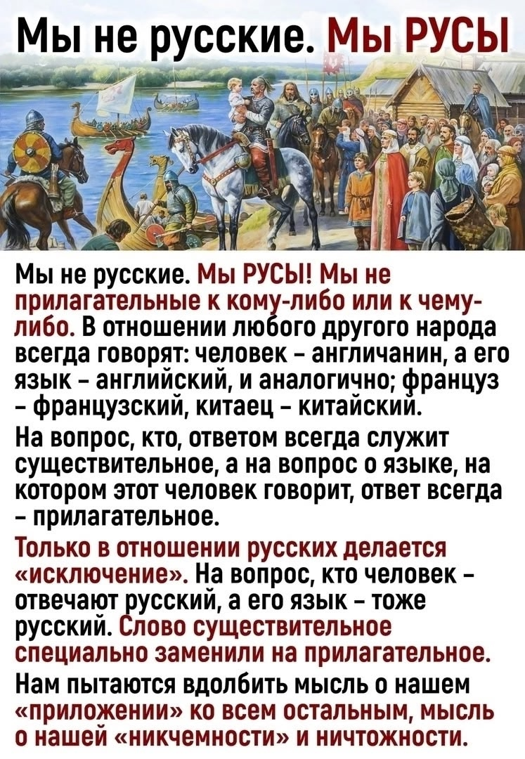 Почему мы считаем мракобесие опасным? Да потому, что далеко не всегда речь идёт о шизофрениках, несущих в целом безобидную чушь. Иногда манипуляции становятся отвратительными и производятся со знанием дела. Ниже представлен ярчайший пример манипуляции для формирования в человеке комплекса обиженного патриотизма. Учитывая, что большинство листателей ленты не будут перепроверять написанное, кто-то всерьёз воспримет данную чушь! Такого рода посты служат лишь для подпитки махрового национализма и иррациональной нетерпимости к остальным. В реальности же ничего плохого и предосудительного в слове "русские" нет - это субстантивированное прилагательное. Субстантивированное прилагательное — это прилагательное, которое приобрело значение предмета, потеряв значение признака предмета. Другими словами, такое прилагательное перестаёт отвечать на вопрос «какой?», а начинает обозначать сам предмет — отвечать на вопрос «что? кто?» Таких слов в нашем языке не мало: запятая, приданое, городничий, подн