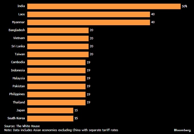 У Индии самая высокая ставка из всех ключевых азиатских торговых партнеров США (тарифы для Китая пока здесь не учитываются)