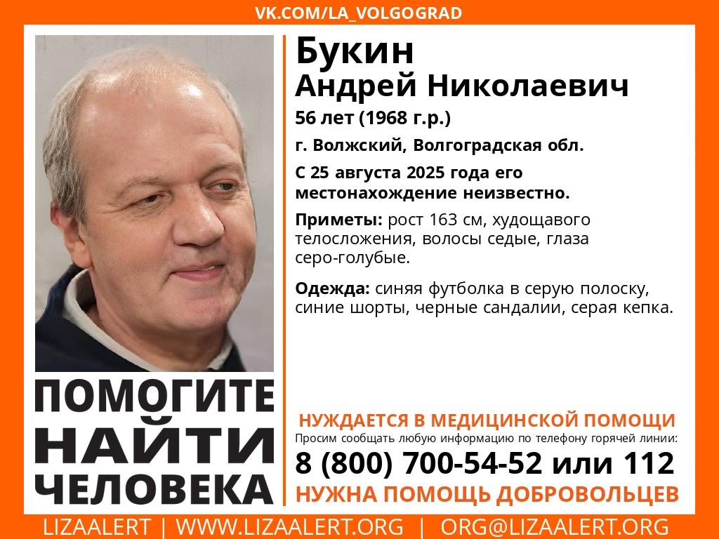 В Волжском пропал без вести 56-летний Андрей Букин. Поиски объявил отряд «Лиза Алерт». Местонахождение мужчины не известно с 25 августа. Он нуждается в медицинской помощи. Андрей Букин не очень высокий, худощавый, у него седые волосы и серо-голубые глаза. В день исчезновения был одет в синие шорты, черные сандалии и серую кепку. Любую информацию о нем можно сообщить в правоохранительные органы. Ранее в Камышине пропала без вести 37-летняя Надежда Бабенкова. Она также нуждается в медицинской помощи. Также в регионе больше двух месяцев продолжаются поиски 56-детнего Игоря Котляра. Он пропал 14 июня в сельском поселении Озерском Иловлинского района и теперь может находиться в любом городе и районе. Новости Волгограда читайте в удобном формате в нашем телеграм-канале. Анна Анатольева