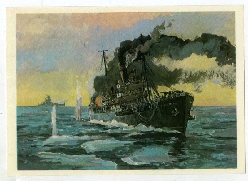 *Открытка «Полярный «Варяг» с изображением боя парохода «Александр Сибиряков» с немецкий тяжёлым крейсером «Адмирал Шеер». Фото: Художник П. П. Павлинов, 1984 год.