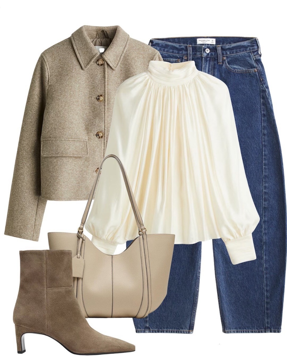 Осень любит благородные фактуры и мягкую светотень. На фото — собранный, «тихий» люкс: короткое шерстяное пальто-пиджак в тёплом бежево-сером, молочная блуза с королевской драпировкой, винтажный тёмный деним, замшевые ботильоны-«стрелы» и лаконичный шоппер-тоте. Получился образ, который одинаково уместен в офисе, на выставке и в бистро. Ниже — полный разбор каждой находки с нюансами посадки, сочетаний и обслуживающих мелочей, которые делают картинку безупречной.