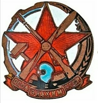 Советский значек 1927-1948 годов. ОСОВИАХИМ СССР (Общество содействия обороне, авиационному и химическому строительству (сокращённо Осоавиахим, ОАХ) — советская общественно-политическая оборонная организация, существовавшая в 1927—1948 годы, предшественник ДОСААФа). Знак представляет собой медальон, образованный зубчатой шестерней слева и серпом и колосьями справа. Центральная часть медальона представлена изображением эмблемы общества: пятиконечная звезда, поверх которой размещено рельефное изображение скрещенных винтовки и пропеллера; в нижней левой части эмблемы расположено изображение молота, а в нижней центральной ее части – изображение противогаза. 1500 р. Почта 150 р. От Александра Железняка