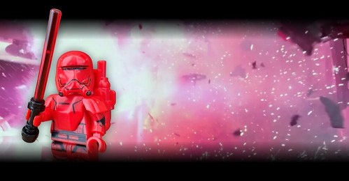 Штурмовик Первого Порядка с красным световым мечом! Any Bricks создал невероятную сцену — штурмовик в динамичной позе с ярко-красным клинком. Фон из розовых и фиолетовых оттенков с разбросанными обломками добавляет драматизма. Выглядит эпично и заставляет задуматься об альтернативной вселенной! Источник: Flickr Lego Builders group