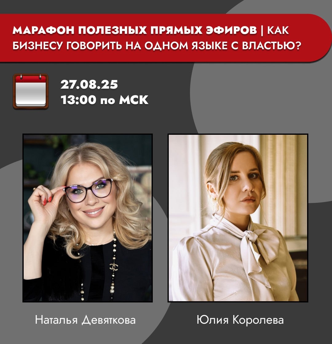 🎯 КАК БИЗНЕСУ ГОВОРИТЬ НА ОДНОМ ЯЗЫКЕ С ВЛАСТЬЮ? Друзья, завтра мы начинаем наш марафон полезных прямых эфиров! 📌 СЕГОДНЯ 27 августа в 13:00 (мск) состоится эфир с Юлией Королевой https://t.me/korolevapr — генеральным директором агентства «Институт Репутации», магистром конфликтологии МГУ и экспертом в области стратегических коммуникаций и GR. Тема эфира: «Стратегия взаимоотношений с органами власти для бизнеса» Что разберем: ▪️ что такое GR-стратегия, ее виды, цели и задачи ▪️ кто такие стейкхолдеры и как выстраивать с ними грамотные отношения ▪️ какие технологии помогают создать положительный образ компании ▪️ как анализировать и описывать ситуацию, чтобы бизнес воспринимали всерьёз Это тема, которую часто недооценивают. Но именно от выстроенных отношений с властью и ключевыми партнерами зависит, как быстро ваш проект будет двигаться и какие возможности вы сможете открыть. 🗓 Не пропустите! Встречаемся в 13:00 по МСК, ссылка на подключение будет в моем канале: https://t.me/d