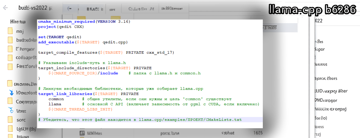 Расположение: Поместите исходный код примера (например, `qedit.cpp`) и его `CMakeLists.txt` в подкаталог `examples/<имя_примера>/` внутри корня проекта `llama.cpp`. Например: `llama.cpp/examples/qedit/`.