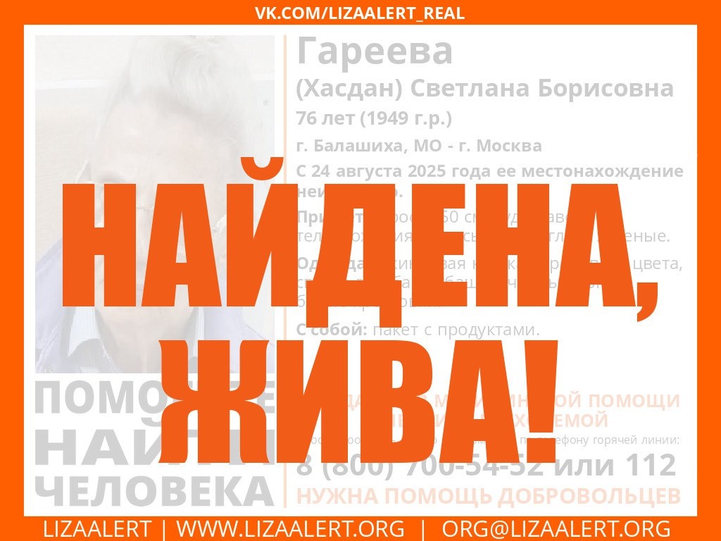 ❤️🔥 К счастью, уже 26 августа появилась радостная новость: женщина найдена и с ней всё в порядке. По словам свидетелей, она была с пакетом, полным продуктов, — вероятно, после похода в магазин не смогла вспомнить, куда идти.