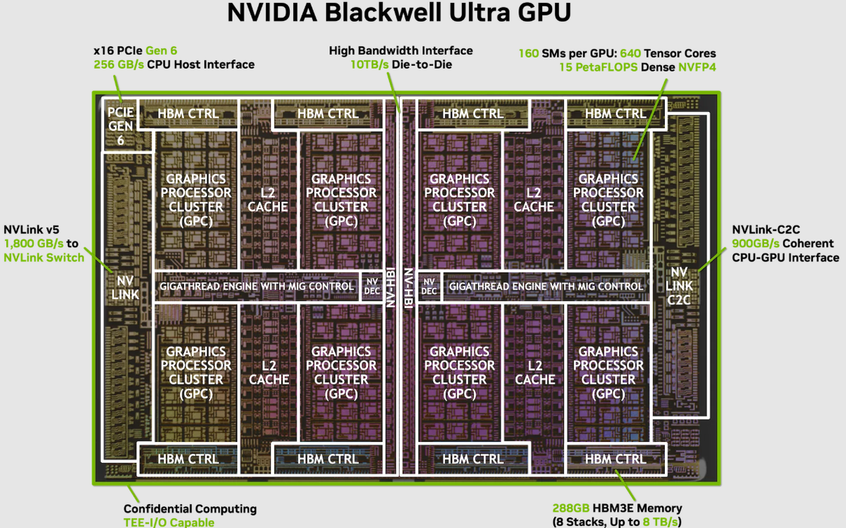 NVIDIA представила подробную информацию об ускорителе Blackwell Ultra GB300. Чип отличается увеличенным числом ядер, объёмом памяти, поддержкой хостов I/O и запасом мощности по сравнению с GB200. Новый GB300 использует два кристалла на базе техпроцесса TSMC 4NP, которые работают как один графический процессор. Кристаллы соединены с помощью шины NV-HBI со скоростью 10 ТБ/с и содержат в общей сложности около 208 миллиардов транзисторов. Графический процессор содержит 160 потоковых мультипроцессоров. Каждый содержит 128 ядер CUDA (всего 20480 ядер) и тензорные ядра 5-го поколения с форматами FP8, FP6 и новым NVFP4. Каждый мультипроцессор также имеет 256 КБ тензорной памяти (TMEM), что составляет 40 МБ на графический процессор, а также дополнительные блоки специальных функций для ядра математических вычислений. Память включает восемь 12-Hi стеков HBM3E с общим объемом 288 ГБ. Пропускная способность составляет 8 ТБ/с благодаря топологии контроллера 16x512 бит (8192-битный интерфейс). Мощнос